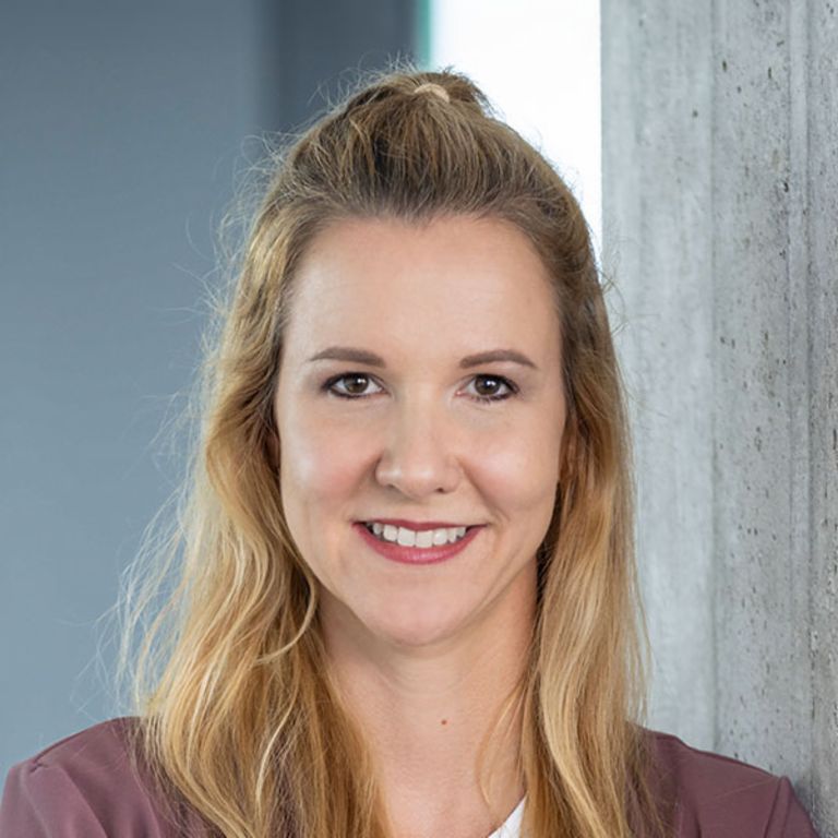 Eva Griewel, woman standing in a pink blazer and white shirt in a bright room
